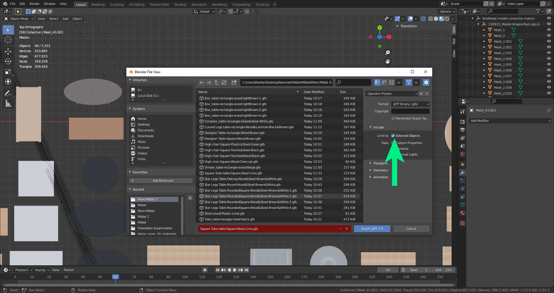 Unter „Format“ (grüner Pfeil) gibt es mehrere Optionen. .glb hat eine geringere Dateigröße und ist die beste Wahl für ein endgültiges Modell, kann aber nach dem Speichern in diesem Format nicht mehr leicht verändert werden. Das .glTFplugin-autotooltip__default plugin-autotooltip_bigglTF