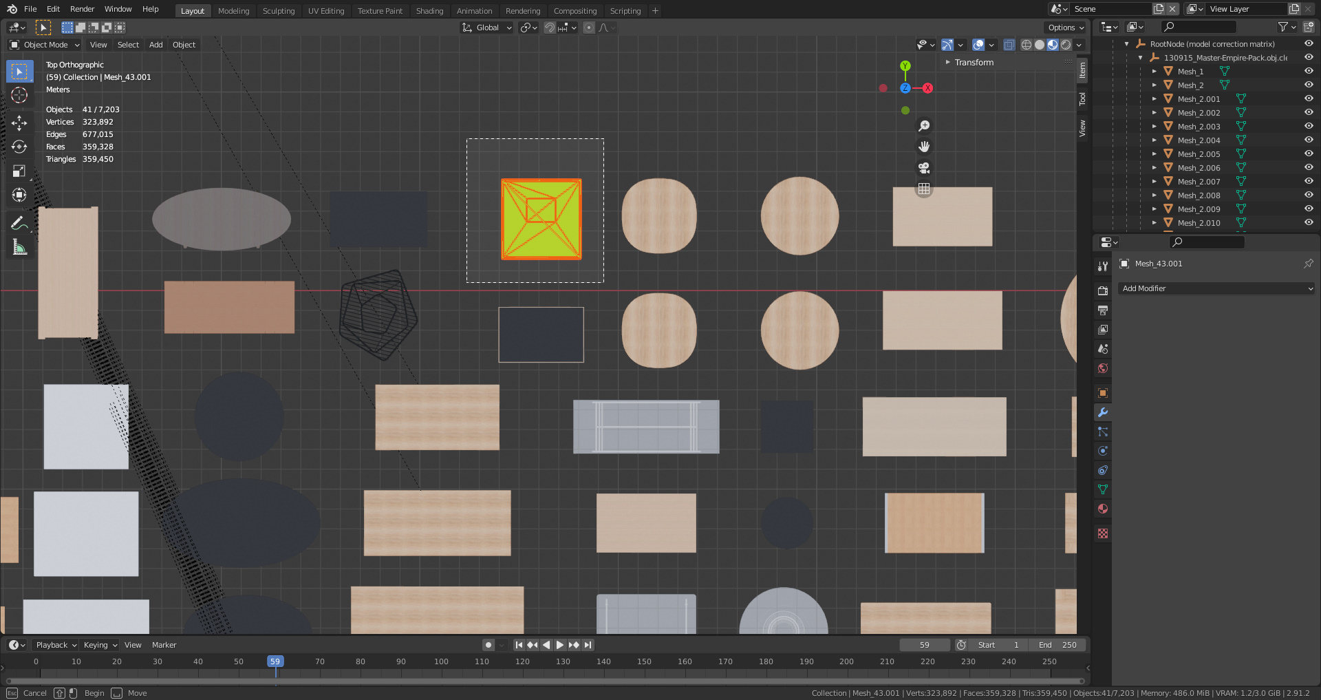 Es ist möglich, das gewünschte Modell im Objektmodus auszuwählen. Dies wird durch die Verwendung einer orthografischen Ansicht (in diesem Fall von oben nach unten) erleichtert.