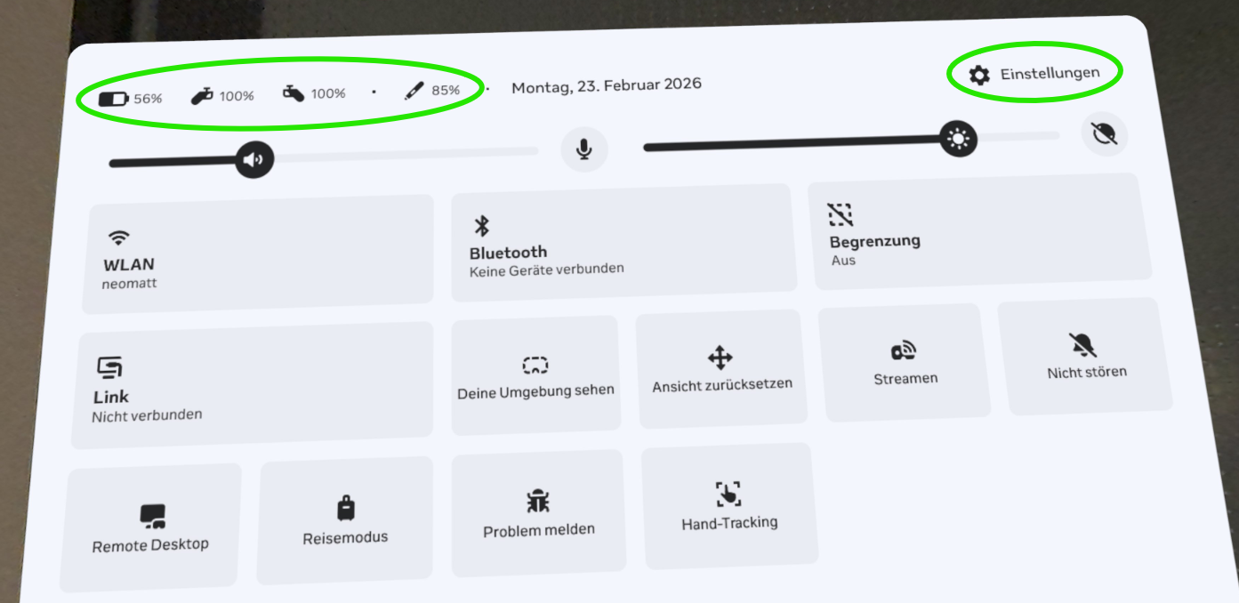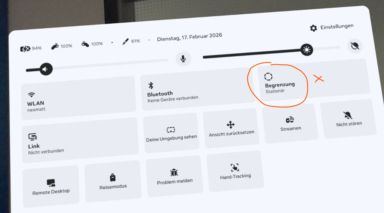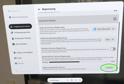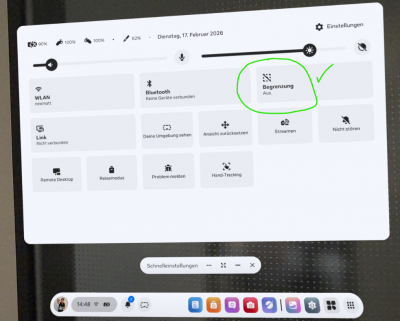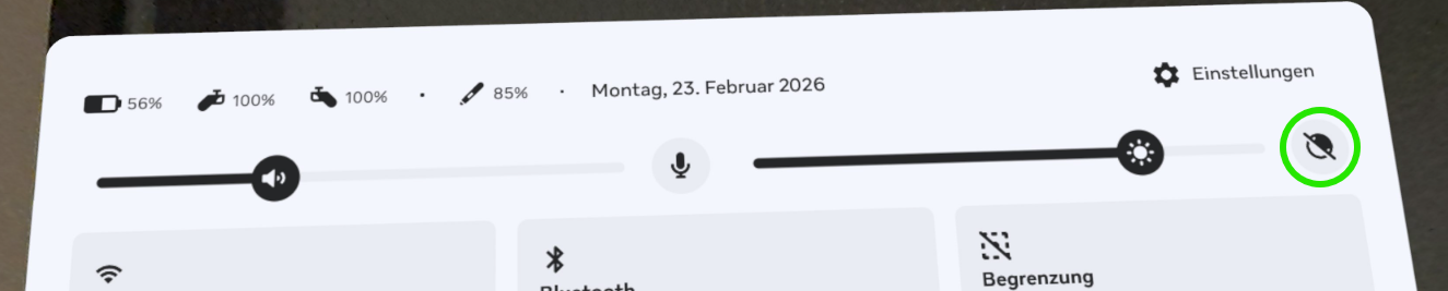 Wenn Du das Headset aufsetzt und die visualizer Projekte verwendest, dann kannst Du Dich frei im Raum bewegen. Die Objekte werden immer angezeigt und sie befinden sich an der gleichen Stelle im Raum. Unter den Schnelleinstellungen (Klick auf das Batterie-Symbol) musst Du sehen, dass die „Begrenzung aus“ ist: