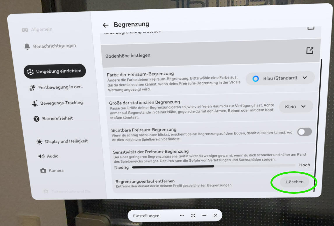 Prüfe einmal, ob Du in der Vergangenheit bereits Begrenzungen erstellt hast. Gehe dazu zu den Einstellungen, wie oben beschrieben. Öffne dort den Punkt Umgebung einrichten und lösche den Begrenzungsverlauf.