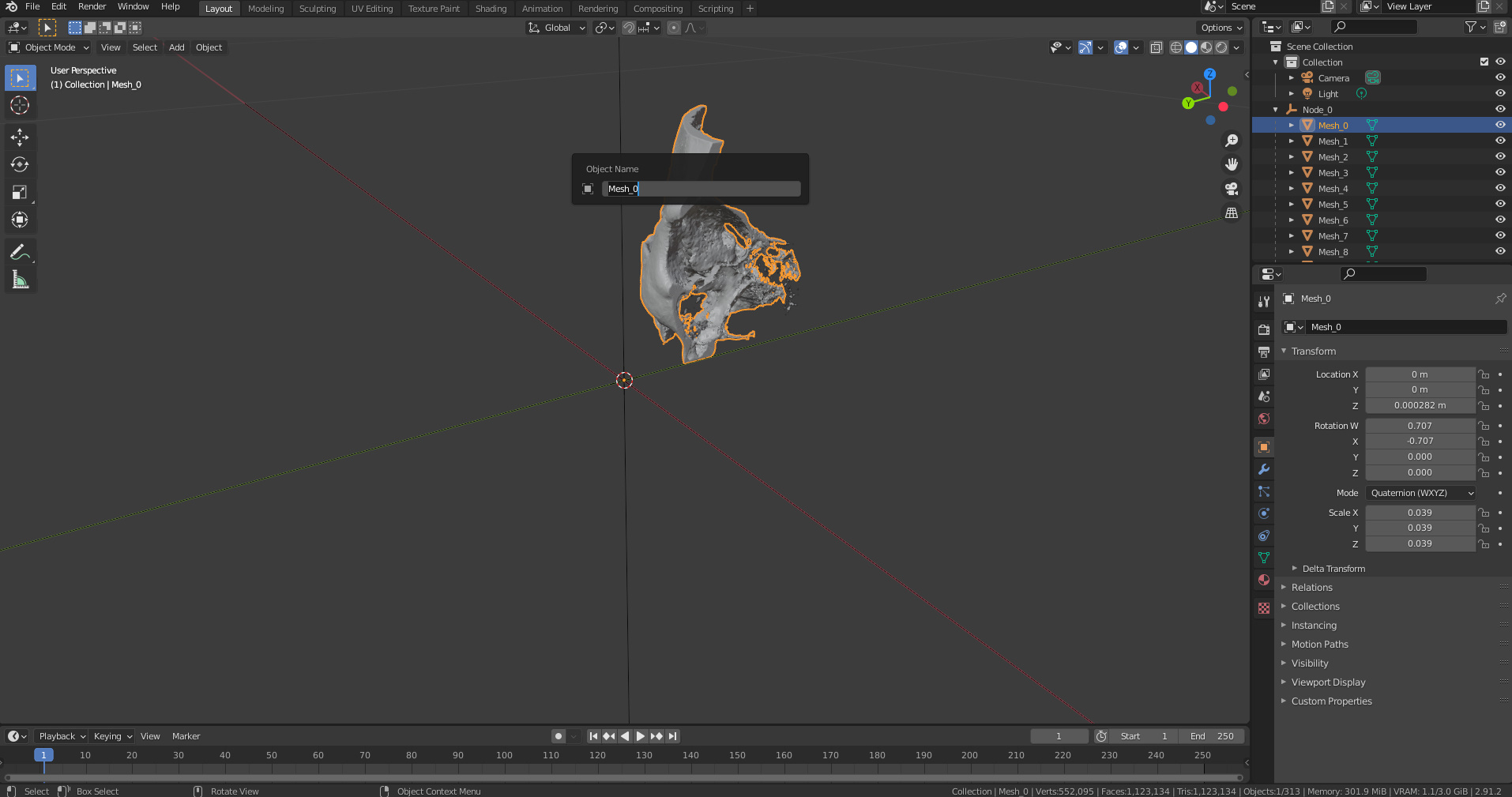 Der bereitgestellte Scan kann aufgrund der Auflösung des Originalscans Probleme aufweisen. Dies führt zu vielen „Floatern“, unzusammenhängenden Polygonen, die nicht mit dem Hauptkörper verbunden sind. Diese sind eine unnötige Belastung für den Computer.