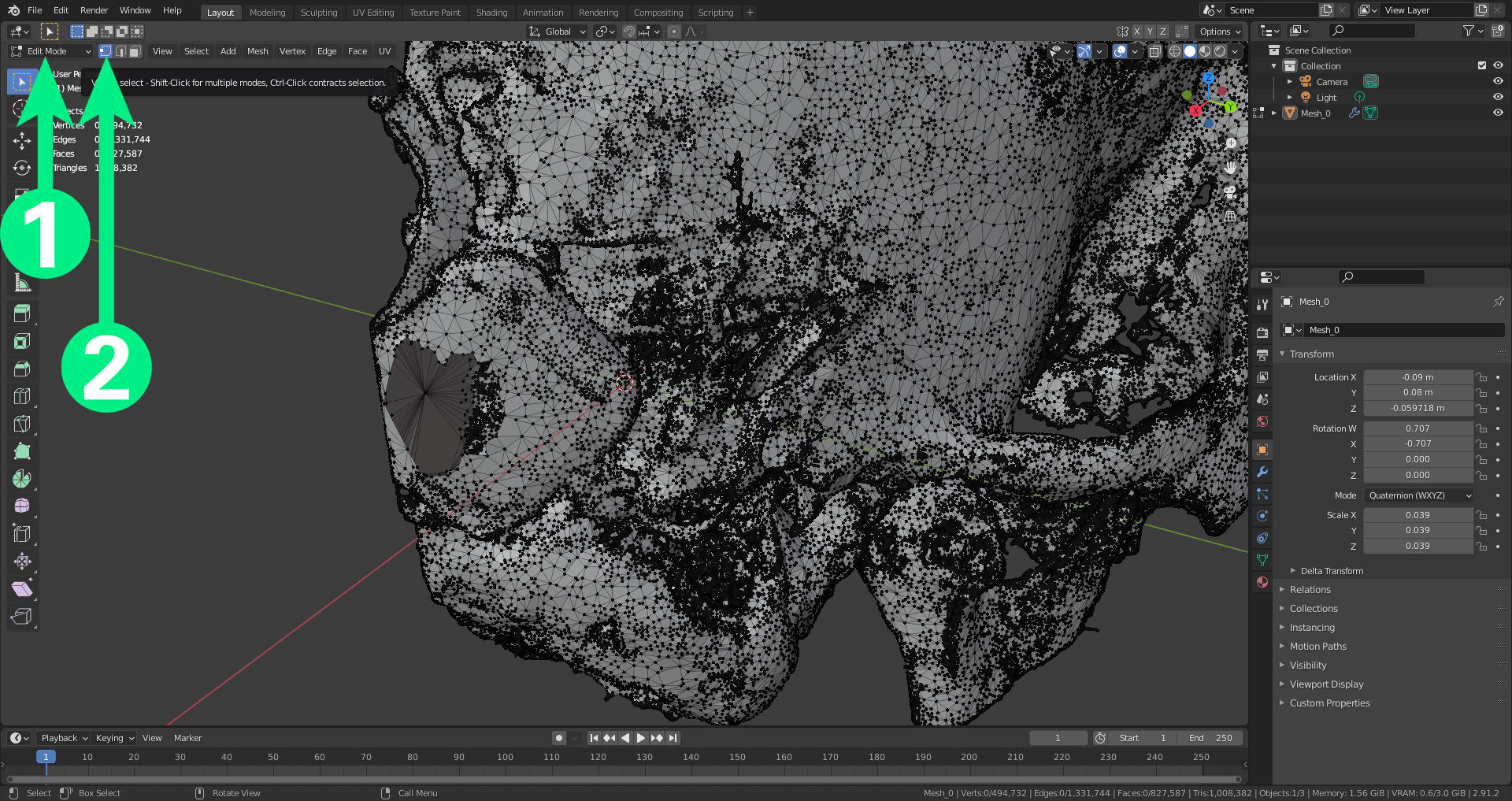 Um dies zu korrigieren, wechseln Sie in den Bearbeitungsmodus (1) und stellen Sie sicher, dass die Kantenauswahl eingeschaltet ist (2).