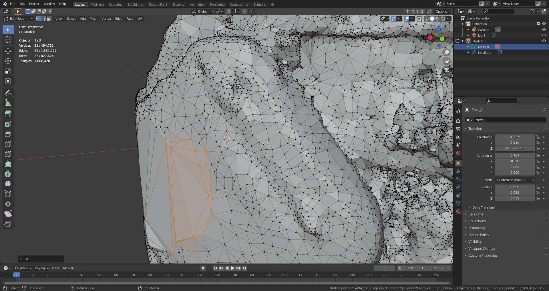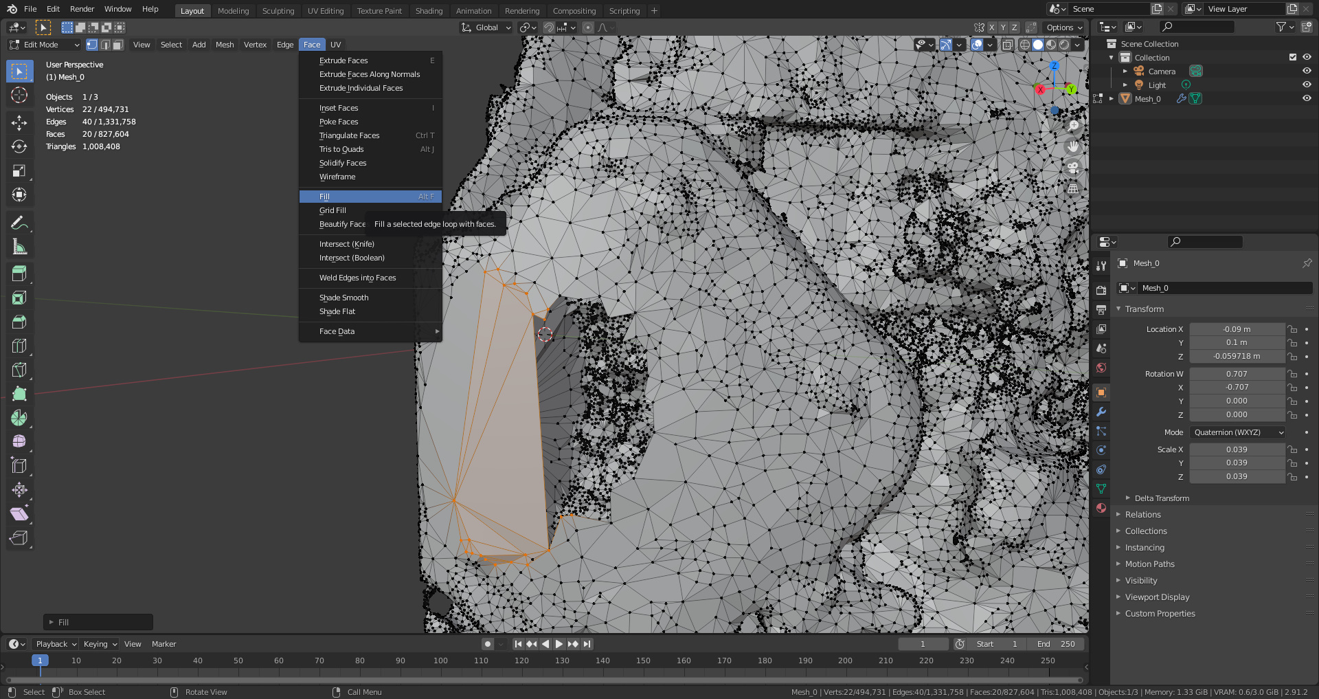 Drücken Sie F, um zwischen den ausgewählten Kanten zu füllen. Dies funktioniert auch bei kleinen Löchern, die beim Dezimieren und anderen Operationen entstehen.
