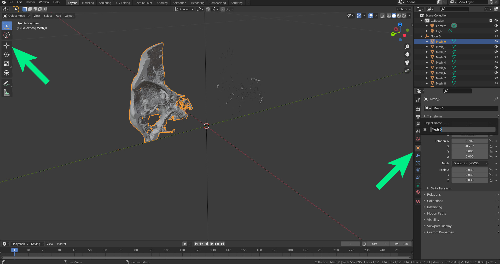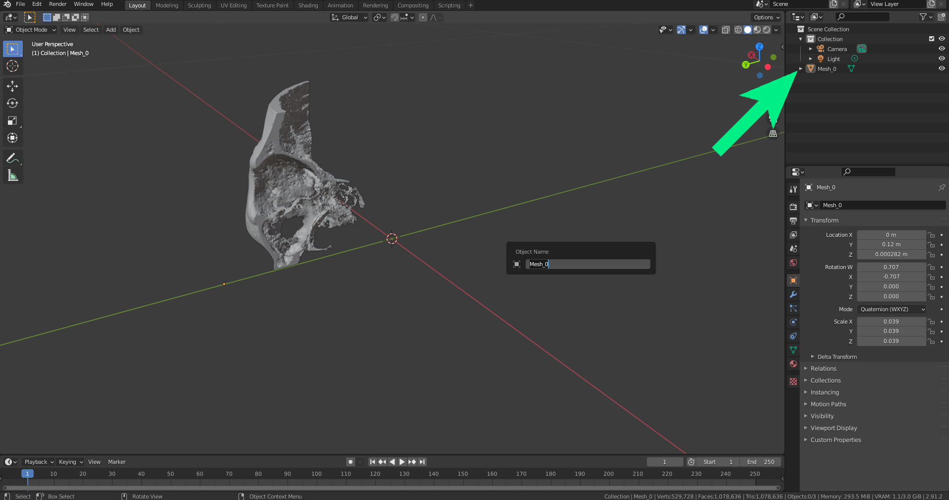 The scan provided may have problems due to the resolution of the original scan. This leads to many “floaters”, disjointed polygons that are not connected to the main body. These are an unnecessary burden on the computer.