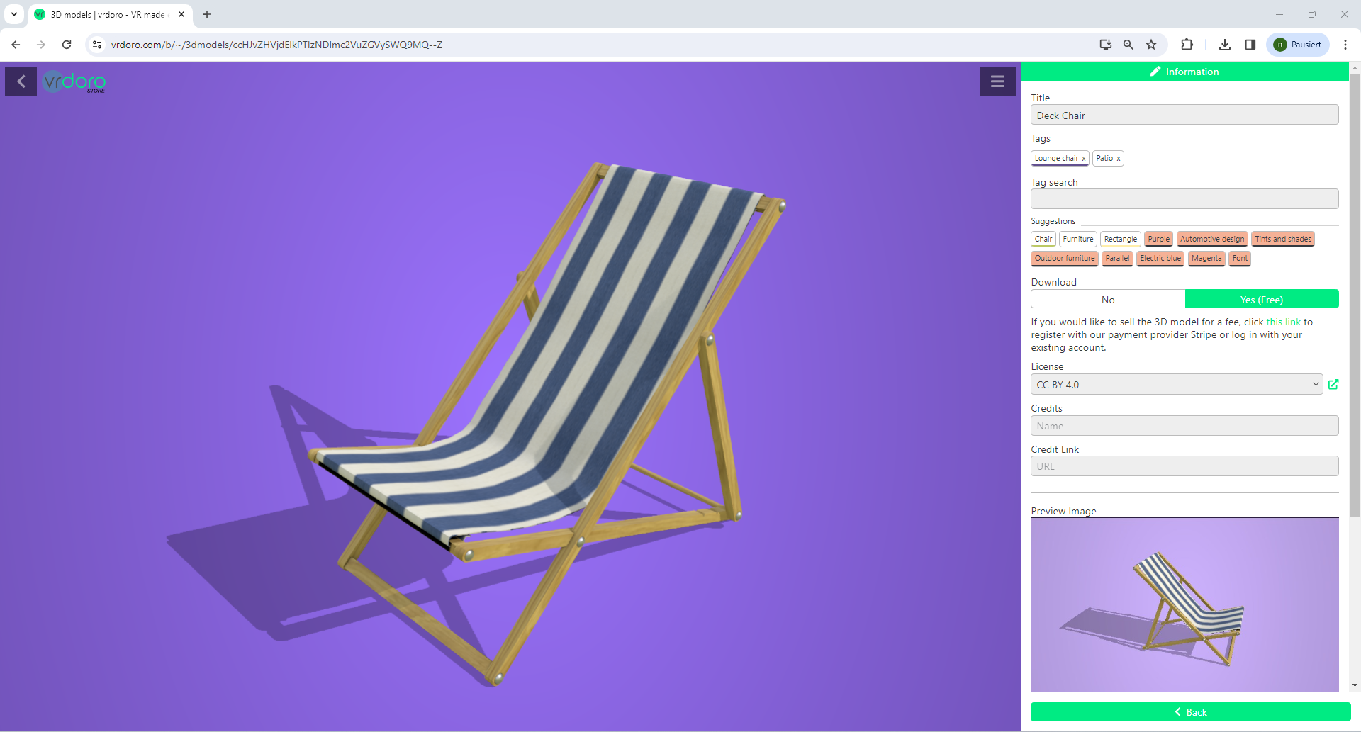 Depending on the device, clicking is the user's action to select an element. On devices with a mouse, this means pointing at the element and pressing the left mouse button. For devices with a touchscreen, it is touching or touching and holding (iOS: long touch). In theing published. Published models are displayed to all visitors to the vrdoro-store. Unpublished models can only be seen by the person who uploaded the model.