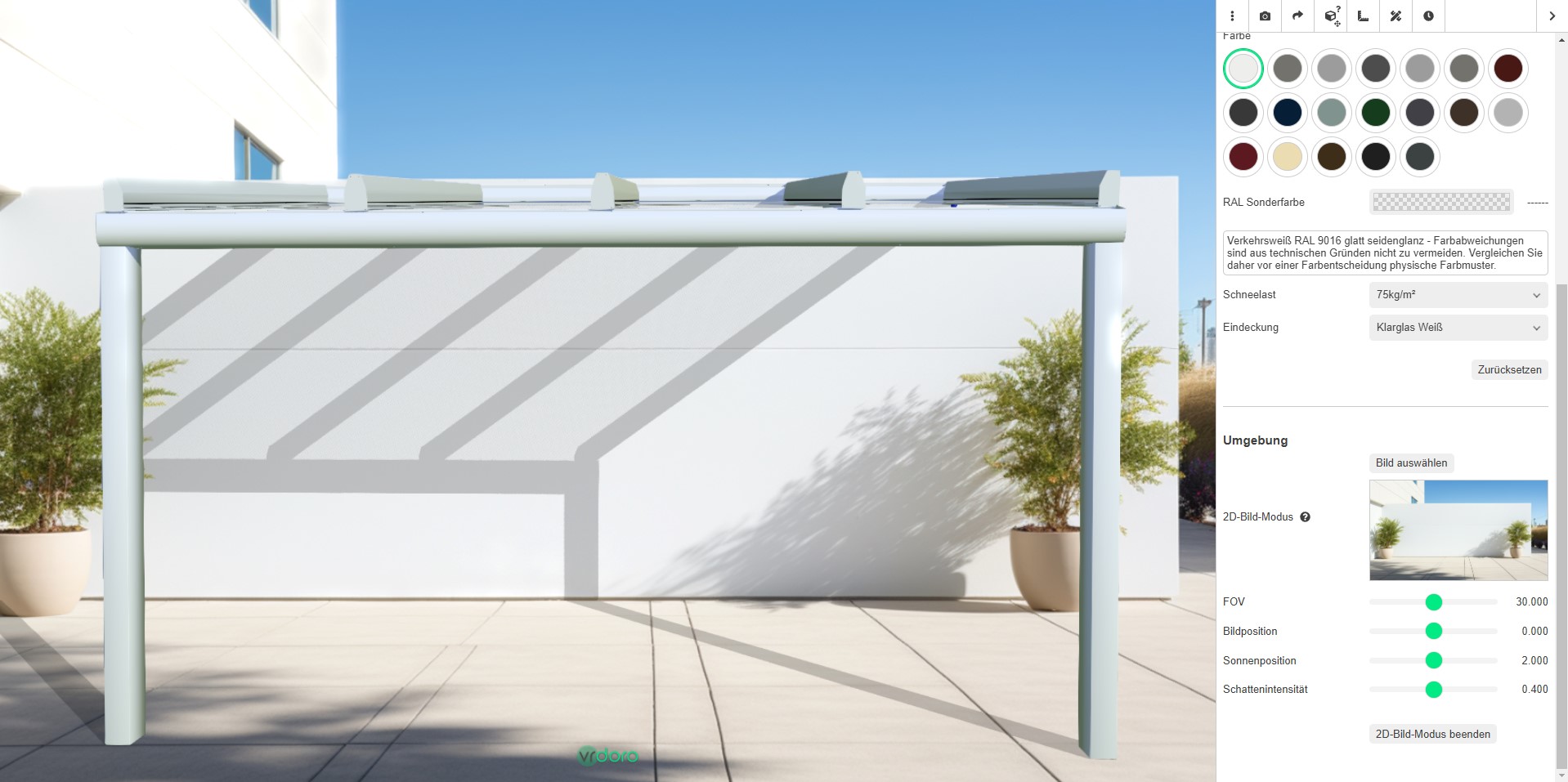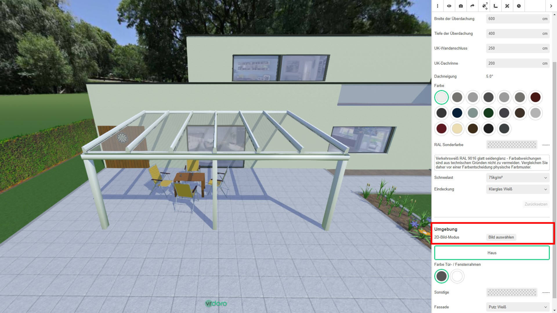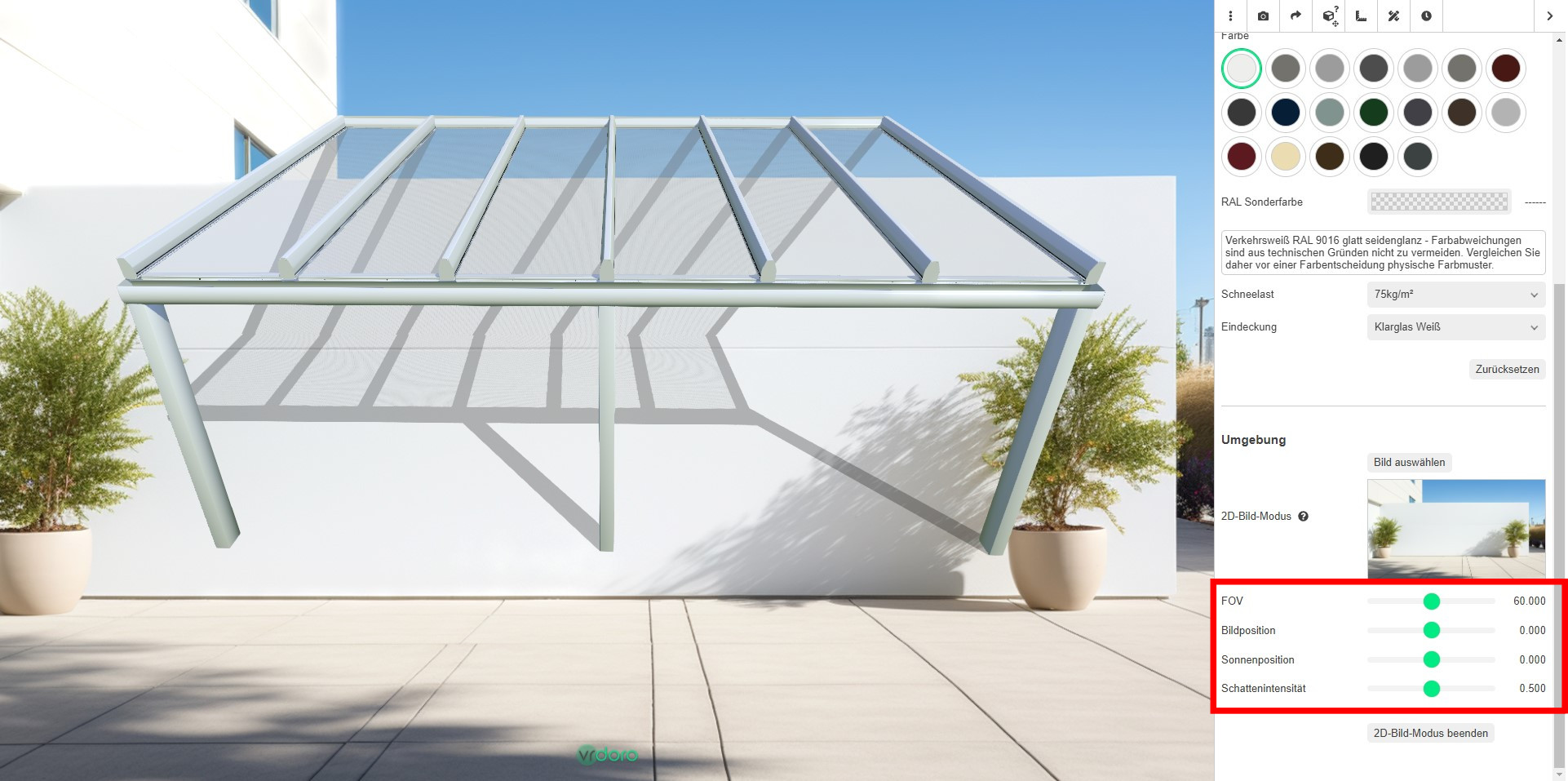 The uploaded image, e.g. a house page, is displayed as the background of the configurable product. To ensure that the three-dimensional product in the foreground matches the background image visually and in perspective and integrates seamlessly, it is usually necessary to adjust the following settings to the background image.