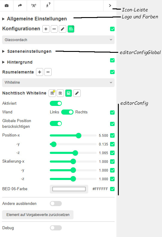 The configurable values and value ranges for the attributes and properties are generally handled in the same way via the editorConfig specifications. For example, a colour selection on an a-plane with colour=colour or on the material-component with material=colour:colour can be made selectable.