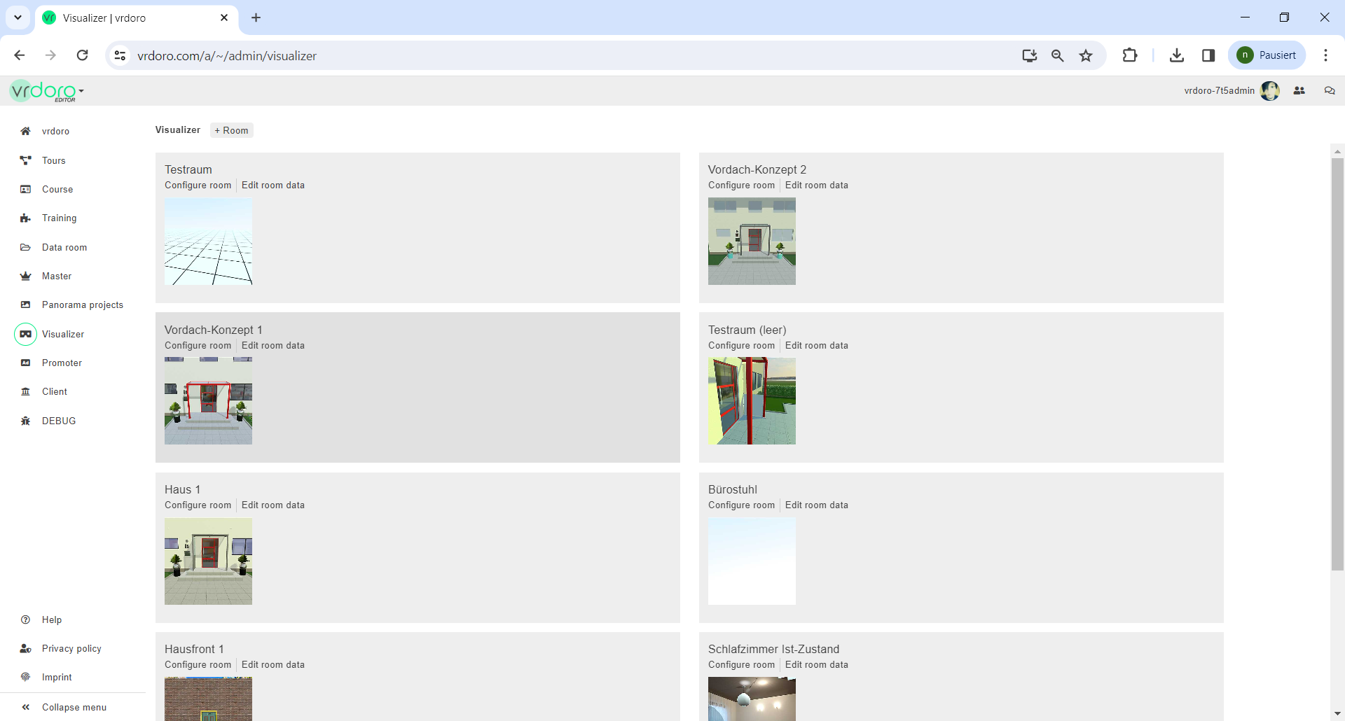 Depending on the device, clicking is the user's action to select an element. On devices with a mouse, this means pointing at the element and pressing the left mouse button. For devices with a touchscreen, it is touching or touching and holding (iOS: long touch). In the on the button +Room, enter a name and save it to create a new VRplugin-autotooltip__default plugin-autotooltip_bigVirtual reality (VR)