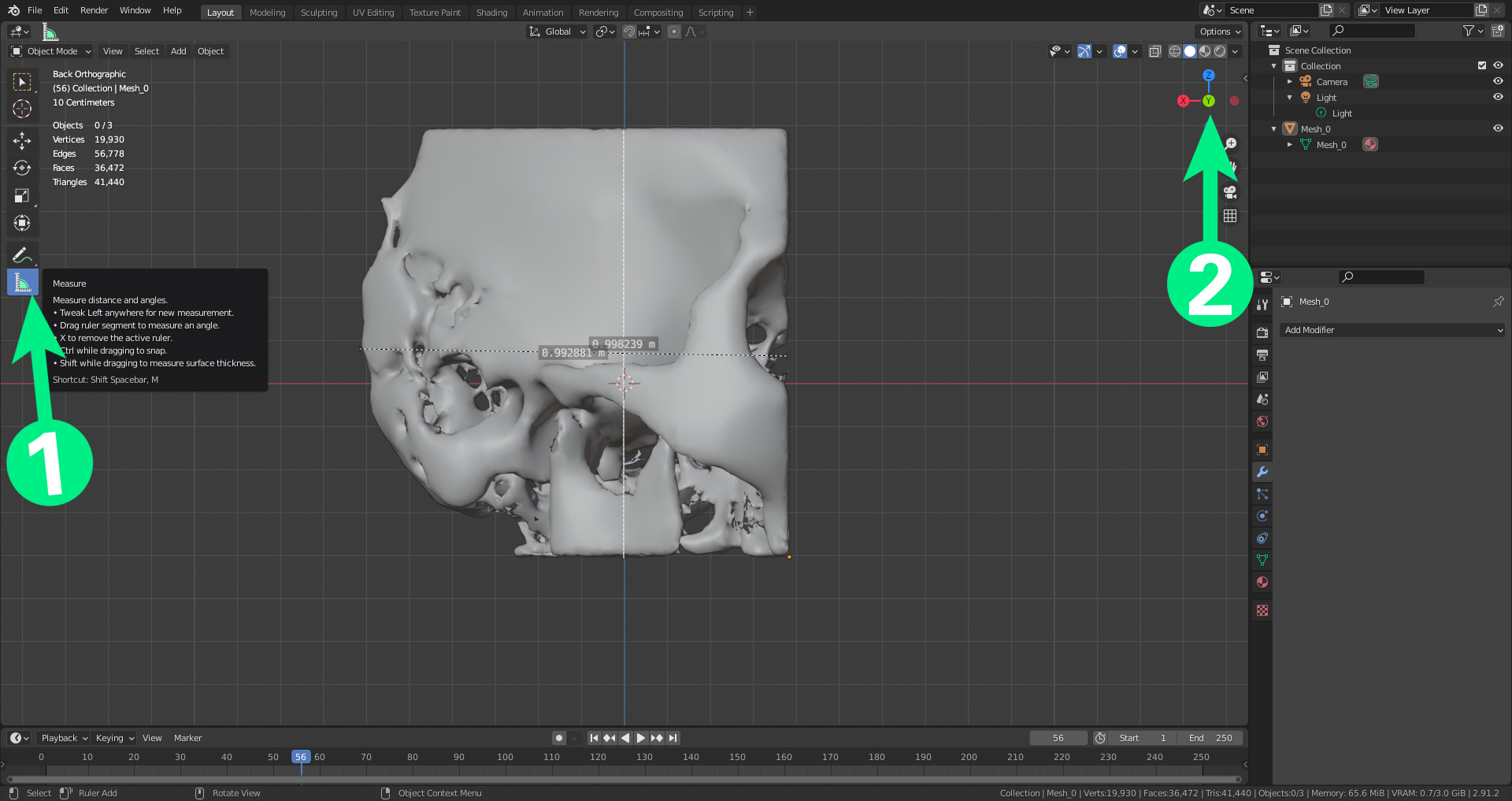 En mode objet, sélectionnez la règle(1). Sélectionnez une vue isométrique pour vous assurer que la règle est parfaitement alignée sur l'axe(2), tracez une ligne entre deux points pour mesurer la distance qui les sépare.