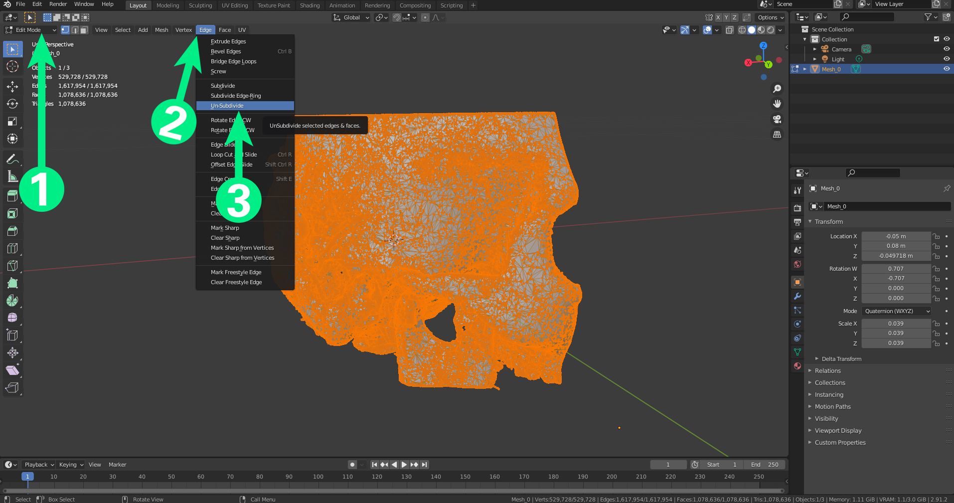 Passez en mode édition (1) et appuyez sur A pour tout sélectionner. Sélectionnez “Bord” (2), puis “non-subdivisé” (3).