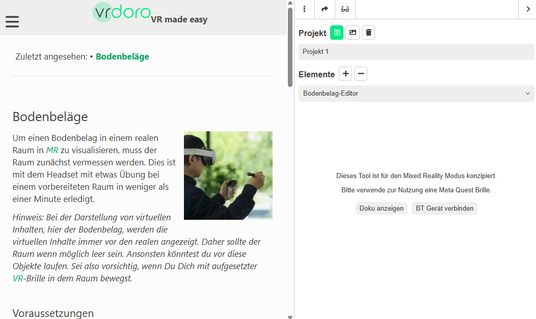 Mixed Reality, ist eine Technologie, die die physische Welt mit computergenerierten Elementen in Echtzeit verbindet. Im Gegensatz zur reinen Virtual Reality, bei der der Nutzer vollständig in eine digitale Welt eintaucht, und Augmented Reality, bei der digitale Elemente über die reale Welt gelegt werden, ermöglicht Mixed Reality eine Interaktion zwischen realen und virtuellen Objekten. In der Regel sieht der Nutzer die reale Welt, durch Kameras aufgenommen, als Abbild seiner … et que des données ont été créées, tu peux passer à l'affichage des résultats en cliquant sur un bouton dans la barre latérale droite. Pour l'éditeur de revêtements de sol, tu vois par exemple le bouton Afficher les mesuresDès que tu as créé des données de mesure pour une pièce, tu peux cliquer sur le bouton “Mesure”.