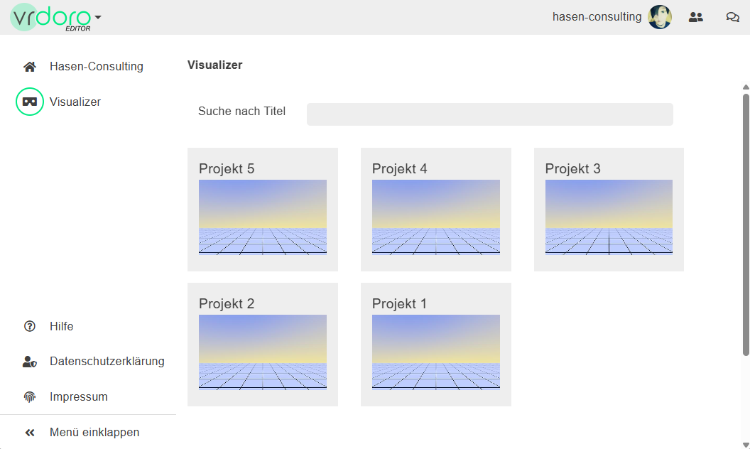 Après l'inscription sous https://vrdoro.com/editor/ tu verras l'option de menu Visualizer dans la barre de menu à gauche. La condition préalable est que tu possèdes une licence valable de vrdoro-visualizer.