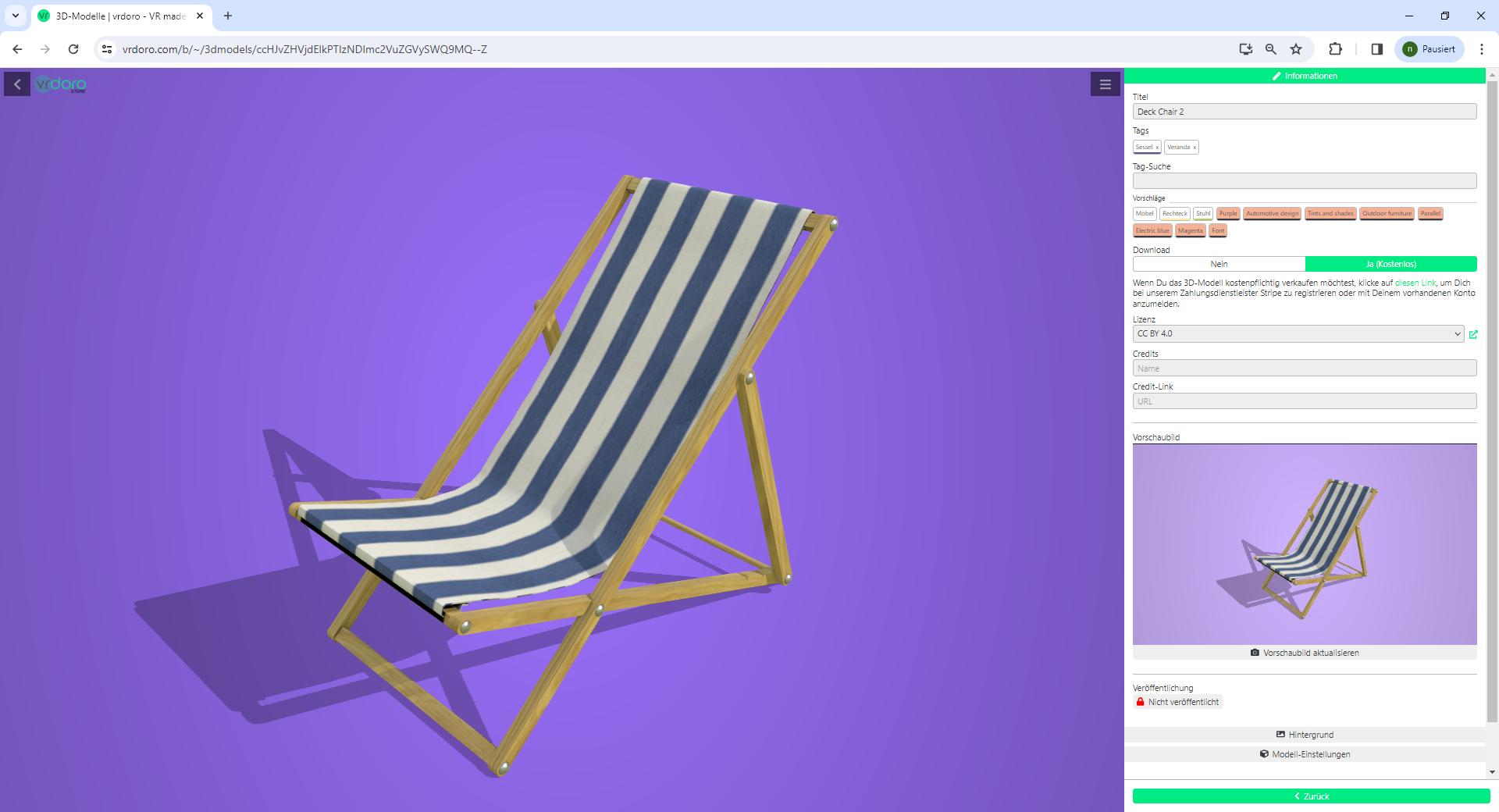 können veröffentlichtwerden. Veröffentlichte Modelle, werden allen Besuchern des vrdoro-store angezeigt. Nicht veröffentlichte Modelle, kann nur derjenige sehen, der das Modell hochgeladen hat.