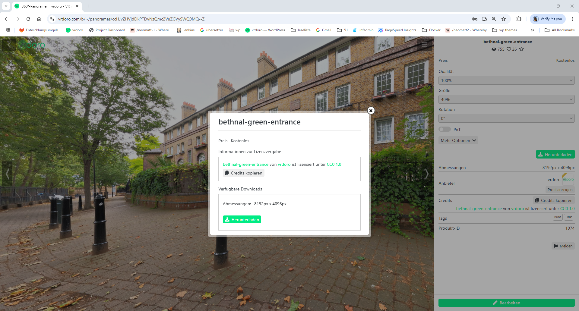 Vor dem Herunterladen des Panoramabildes hat der Benutzer die Möglichkeit, die Größe des Bildes zu wählen. Die maximale Größe entspricht der Größe des hochgeladenen Bildes, die minimale Größe beträgt 256 Pixel für die längste Seite. Beim Herunterladen erhalten wir eine JPG- oder PNG-Datei.