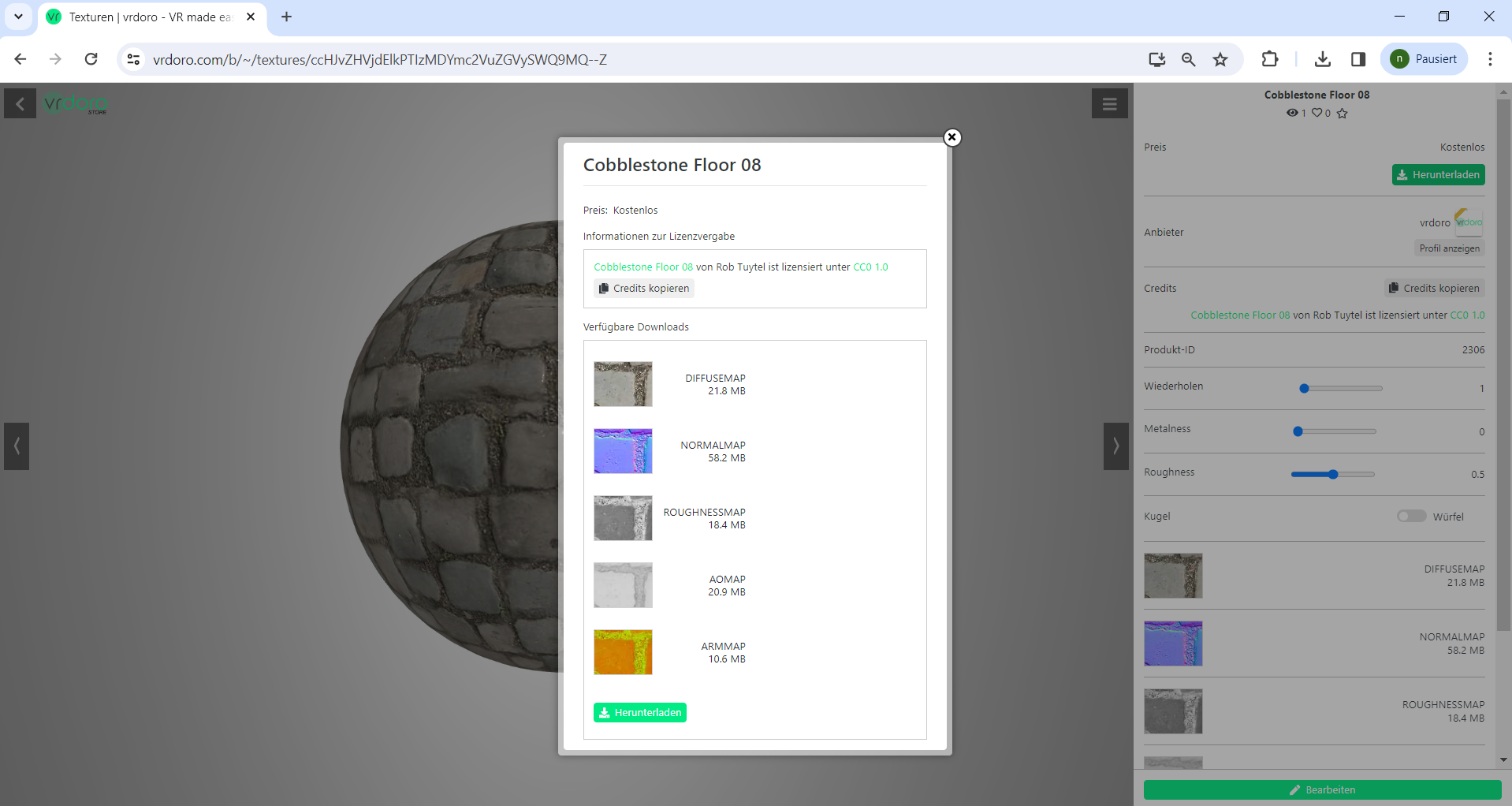 Eine Textur verändert die Oberfläche eines virtuellen Körpers. Sie dienen der Festlegung von Farbe, Rauheit, Glanz und Reflektion der Oberfläche. Damit können z. B. Bodenbeläge oder Wandbeläge sehr realistisch dargestellt werden. wird eine Zip-Datei mit allen Texturdateien heruntergeladen.