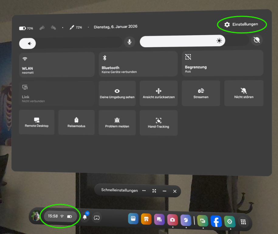 - Drücke die Meta-Taste (siehe Headset-Controller) einige Sekunden (bis der angezeigte Kreis geschlossen ist): Dies bringt den Browser vor Dich und führt zu einer Neuausrichtung der virtuellen Objekte.