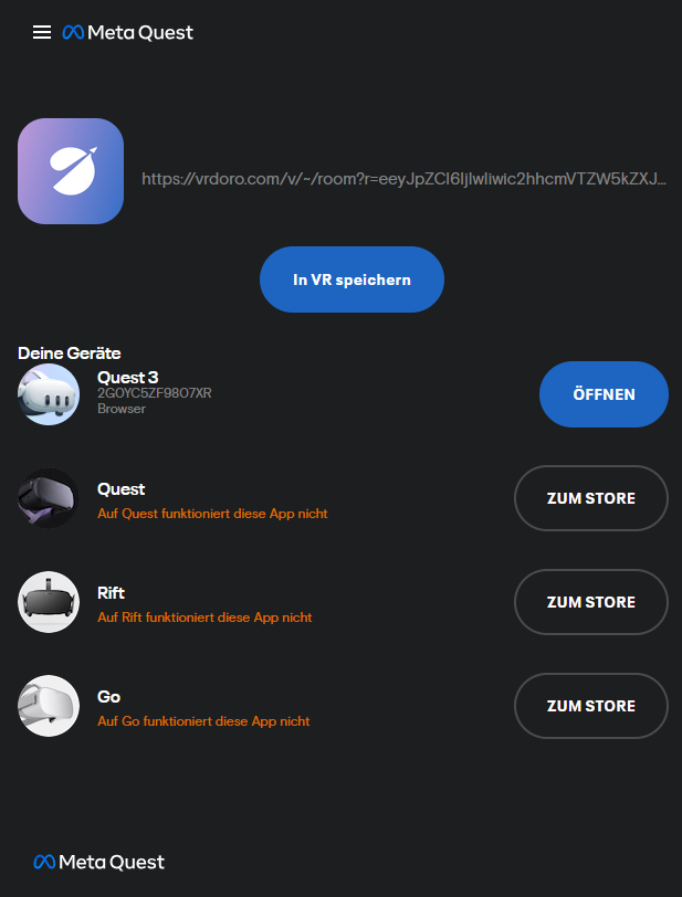 Meta Web-Launch kann die Projektseite in die Brille übertragen werden. Nach Auswählen von Web-Launch wird in einem neuen Browser-Tab eine Seite von Meta geöffnet. Hier ist eine Anmeldung mit dem Meta-Konto, welches für die Meta-App und Brille benutzt wird, erforderlich. In dem Fenster siehst Du Deine verfügbaren Geräte und über öffnen neben dem entsprechendem Gerät öffnest Du die Konfigurator-Ansicht direkt im Headset.