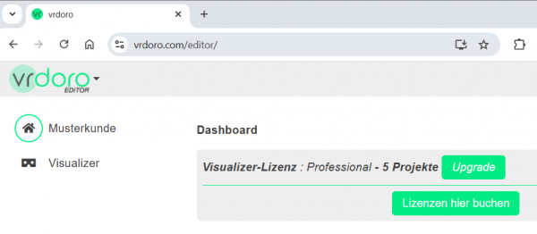 Nach der Buchung eines visualizer Lizenzplans (https://vrdoro.com/pricing/) erstellen wir Dir einen Bereich, zu dem Du einen Zugang von uns erhältst. Alternativ kannst Du Deinen Bereich vor der Buchung durch die Registrierung selbst erstellen.