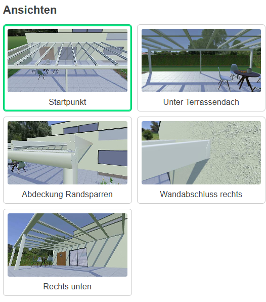Wähle hier unter verschiedenen Ansichten aus. Das Vorschaubild gibt hier einen ersten Eindruck. Wird eine andere Ansicht als die Standardansicht ausgewählt, dann erscheint im 3D-Bereich ein Icon (), mit dem wieder die Standardansicht ausgewählt werden kann.