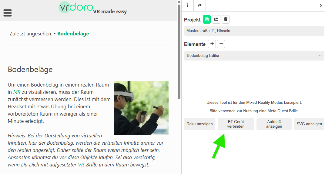 Mixed Reality, ist eine Technologie, die die physische Welt mit computergenerierten Elementen in Echtzeit verbindet. Im Gegensatz zur reinen Virtual Reality, bei der der Nutzer vollständig in eine digitale Welt eintaucht, und Augmented Reality, bei der digitale Elemente über die reale Welt gelegt werden, ermöglicht Mixed Reality eine Interaktion zwischen realen und virtuellen Objekten. In der Regel sieht der Nutzer die reale Welt, durch Kameras aufgenommen, als Abbild seiner …-Brille (Dieses Tool ist für den Mixed Reality Modus konzipiert. Bitte verwende zur Nutzung eine Meta Quest Brille.) eine Schaltfläche mit der Aufschrift BT Gerät verbinden (siehe grüner Pfeil).